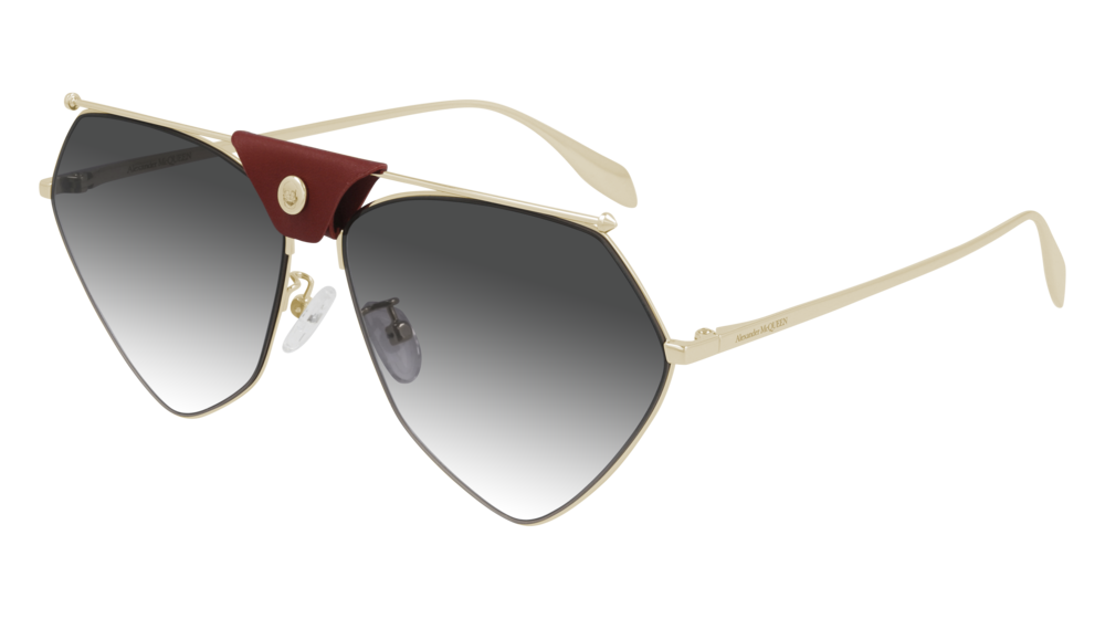 Discover the elegance of the Alexander McQueen AM0317S sunglasses, meticulously crafted in Italy. This stunning accessory features a sleek shiny black frame complemented by a luxurious leather element on the bridge, enhancing its sophisticated appeal. The unique geometric design adds a contemporary flair to your ensemble, making it an eye-catching statement piece. Equipped with grey lenses that offer 100% UV protection, these unisex sunglasses seamlessly blend fashion and functionality. Elevate your style effortlessly with this must-have accessory!